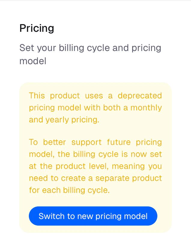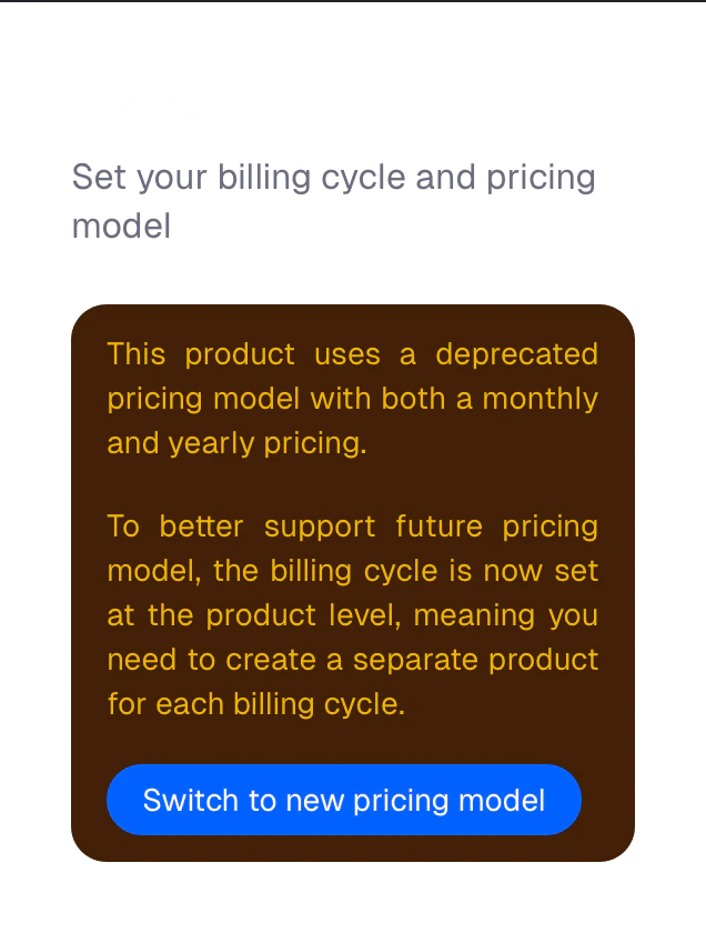 • Products can no longer have both a monthly and yearly pricing. Existing products still work, but you’ll see a warning like this when trying to edit their pricing: