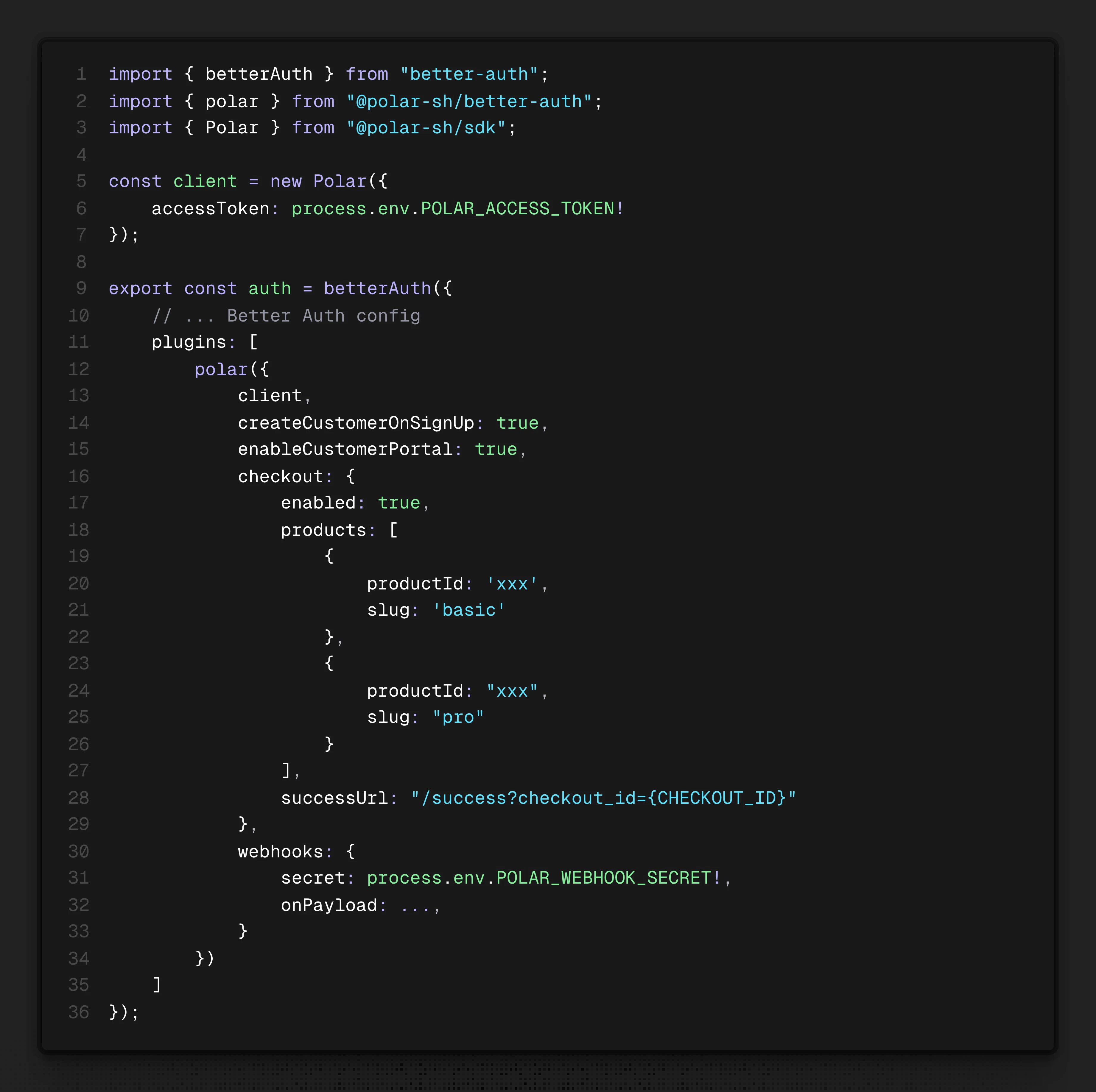 Integrating authentication and billing for your users has never been easier.Better Auth is an open source authentication framework for TypeScript that is quickly becoming a favorite amongst developers. Today, we’re thrilled to have shipped a Polar plugin for Better Auth - in collaboration with them.Checkout our integration guide.
