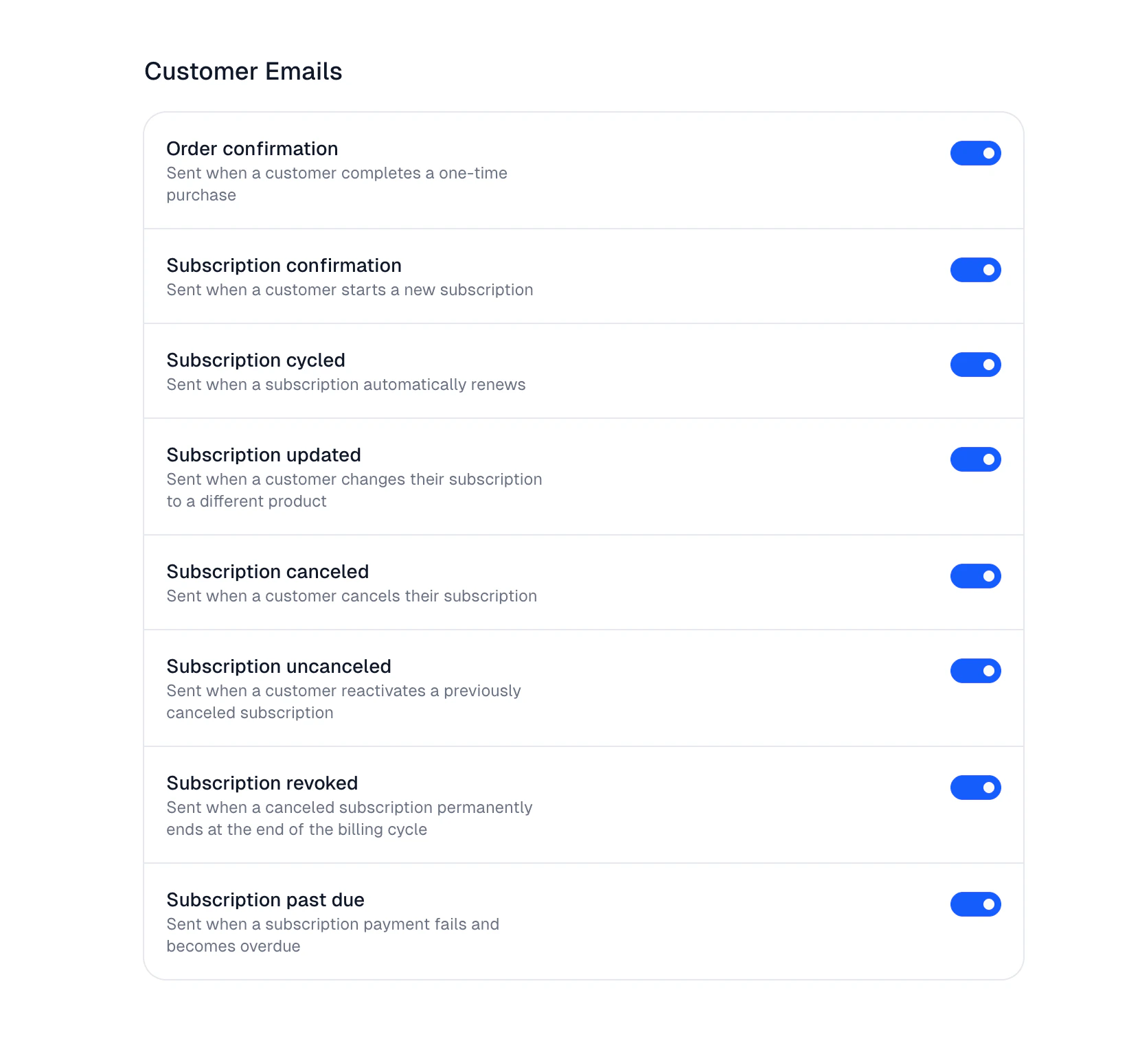 Via the organization settings, you can now disable the emails we automatically send to customers on certain events. This gives you the ability to own the communications with the customers.