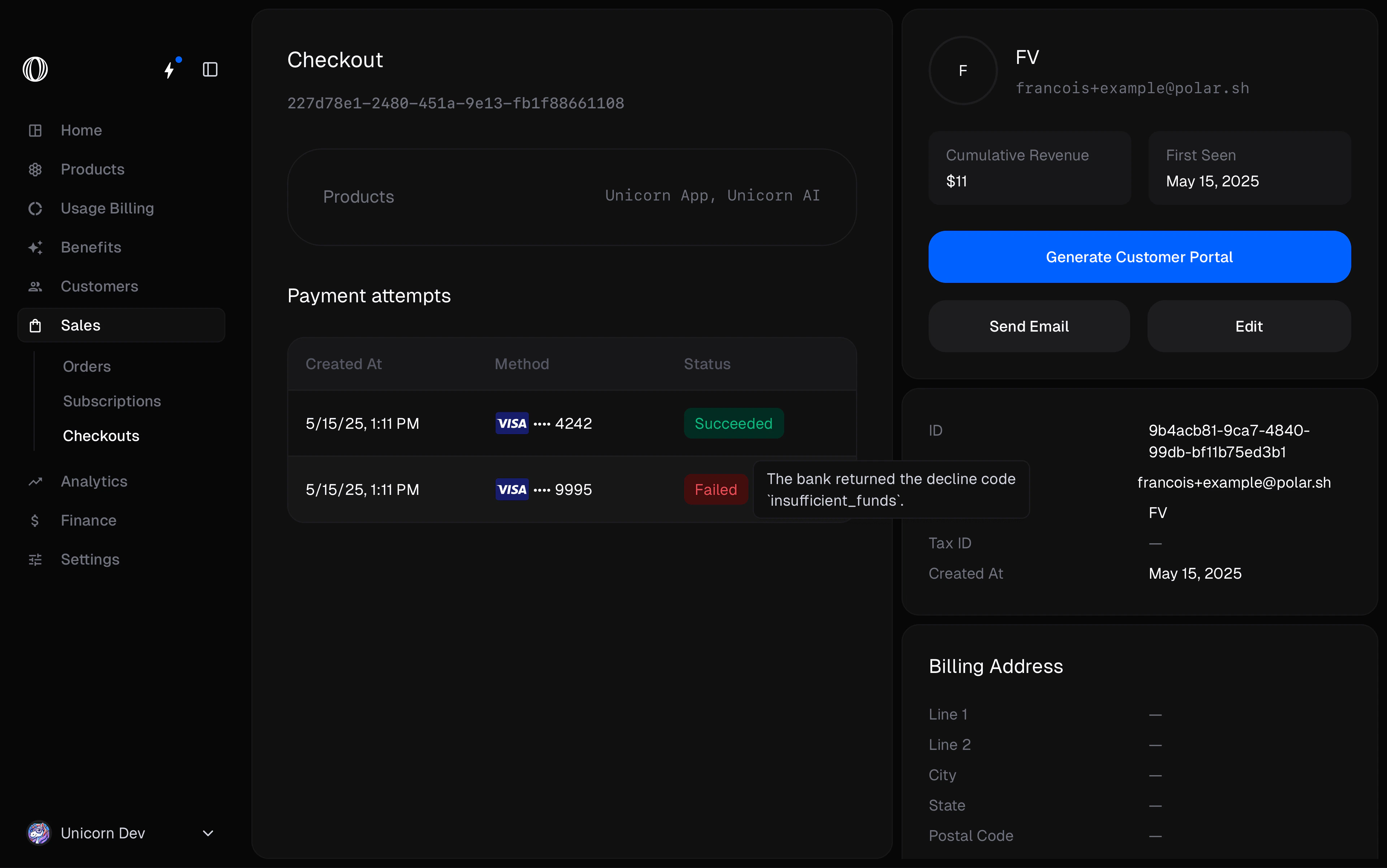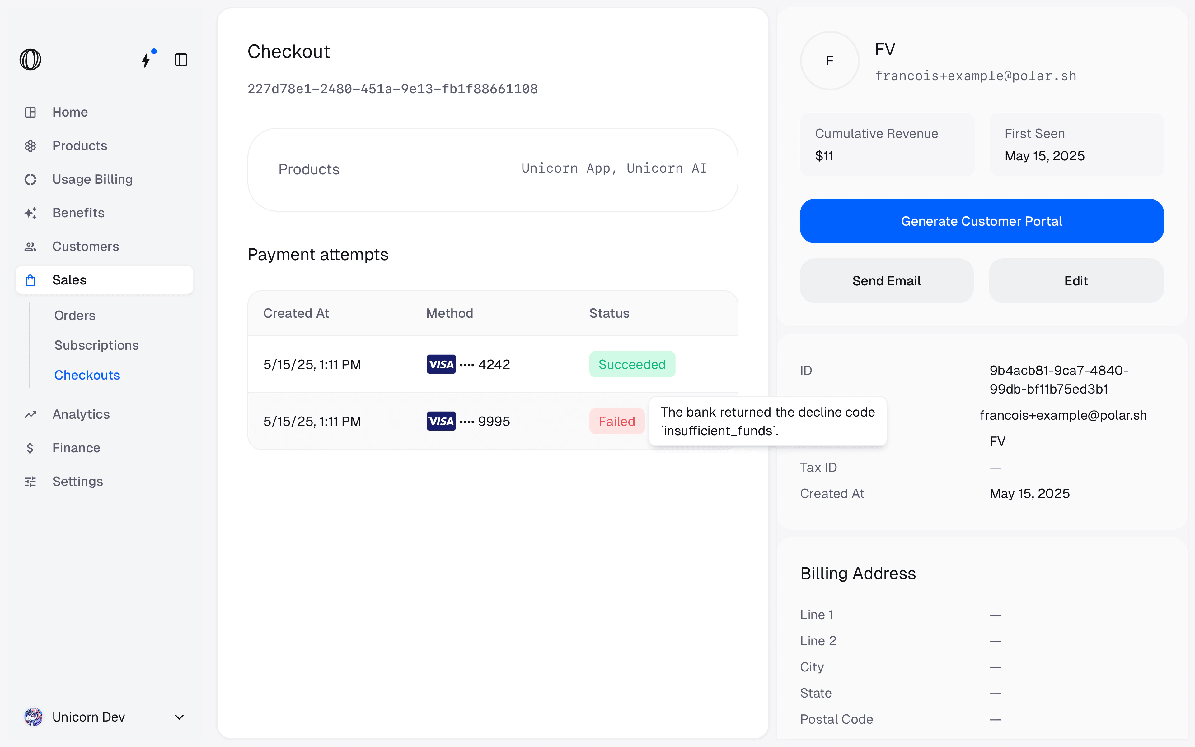 We’ve added a new Checkouts tab under the Sales, where you can review all the checkout sessions, successful or not. You can filter them by customer email, status, and product. You can also see the payment attempts for each checkout session, including the reason for any failed or declined payments.The payment attempts information is also available on each order.Besides, we’ve also added new analytics around checkouts: total number of checkouts, successful checkouts, and conversion rate.